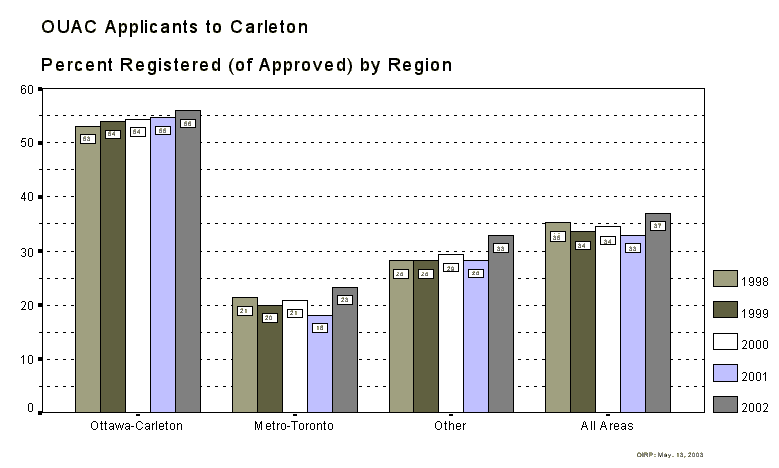 OUAC Applicants to Carleton - Percent Registered (of Approved) by Region